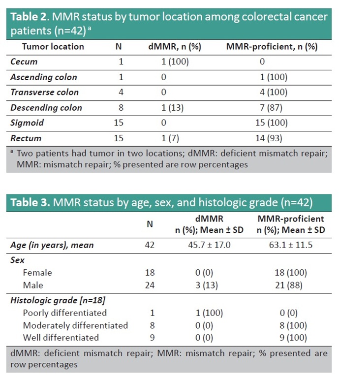 Results. Forty-two (42) patients were included in the study. The mean age of included patients was 61.8 years, and most were males. Half had well-differentiated tumor grade, and the most common tumor locations were rectum (38%) and sigmoid (36%). Three patients (7.14%; 95% CI:1.50-19.48%) were considered deficient. Tumor locations in dMMR patients were the cecum, descending colon, and rectum. Compared to MMR-proficient, dMMR patients had a lower mean age (63.1 vs. 45.7 years). Also, a higher proportion of males (13%) were dMMR than females (0%).