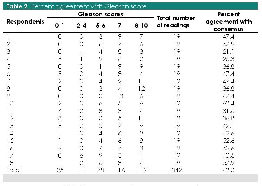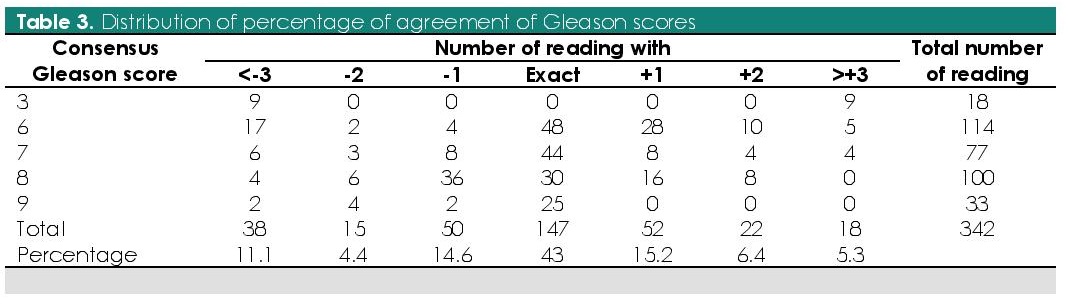Table 3. Distribution of percentage of agreement of Gleason scores