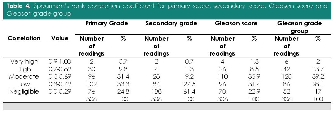 Table 4. Spearman’s rank correlation coefficient for primary score, secondary score, Gleason score and Gleason grade group