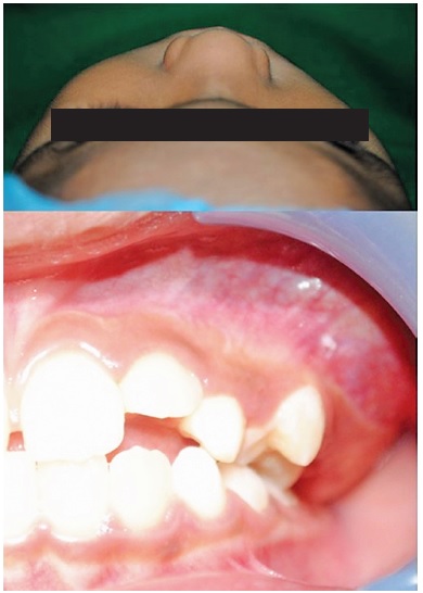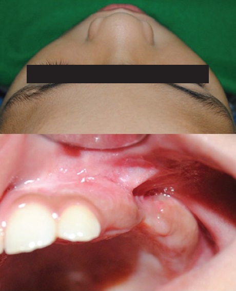 Figure 1. Clinical appearance. Mass producing facial asymmetry on left side of the patient, intra oral finding showing an evident bony hard mass on the posterior region of the left maxilla with noticeable altered eruption pattern of the left permanent molars.