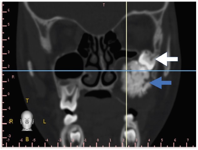 Figure 2. Coronal cut CT scan showing impacted permanent molar and large amorphous opacity surrounded by a defined radiolucency.