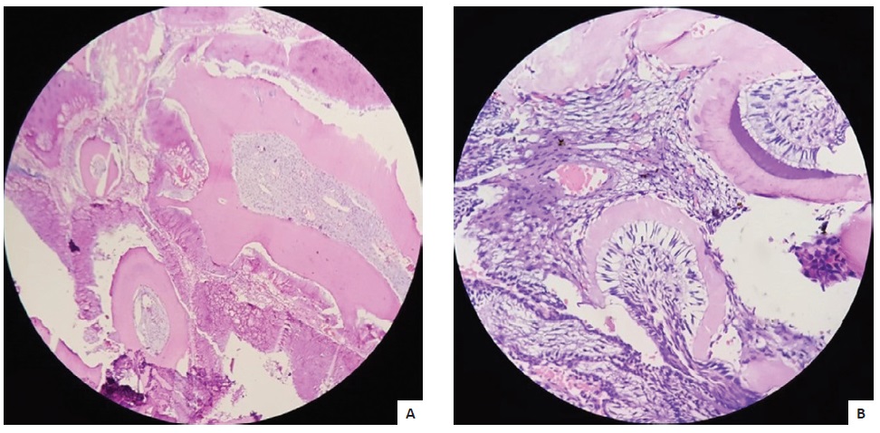 Histologic examination revealed a benign tumor composed of ameloblastic islands amidst a cellular fibrous background (Figure 4), and areas showing dentin formation. (Figure 5). Histomorphologic features were consistent with an ameloblastic fibro-odontoma.