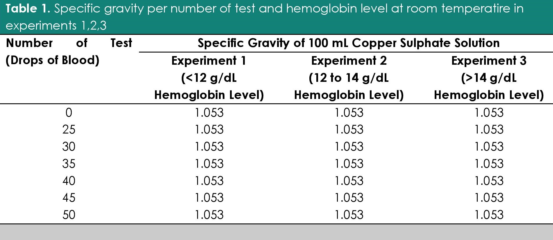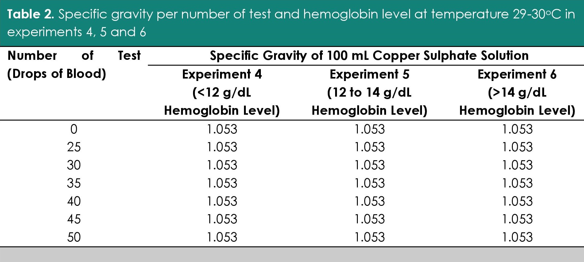 An experimental study was conducted by doing experiments of adding another 25 drops of blood to a 100-ml copper sulphate solutions that have been used for 25 tests, one drop of blood per test, using samples of known hemoglobin levels at assigned working temperatures.