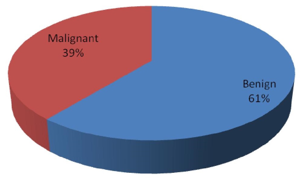 When the final histopathological outcomes were reviewed, there were 120 (39.22%) malignant and 186 (60.78%) benign lesions (Figure 2). Tumor diameters of the malignant and benign cases ranged from 0.8 cm to 10 cm. The maximum number of benign cases was in the age group of 20-24 years while the malignant cases peaked in the age group of 45 to 49 years (Table 3). For the individual categories, there were 2 out of 13 C1 cases, 7 out of 160 C2 cases, 3 out of 23 C3 cases, 7 out of 9 C4 cases and 101 out of 101 C5 cases that turned out to be malignant. The risks of malignancy for each category were as follows: 15% for C1, 4% for C2, 13% for C3, 78% for C4 and 100% for C5 (Figure 3). Individual histopathological results per category are listed in Table 4.