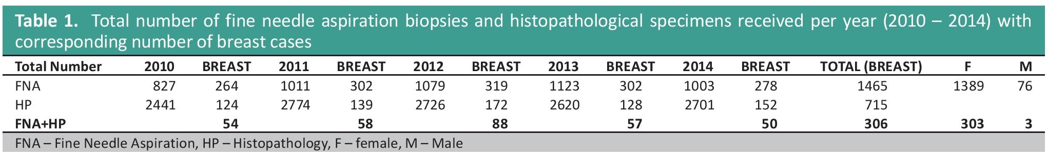 Table 1. Total number of fine needle aspiration biopsies and histopathological specimens received per year (2010 – 2014) with corresponding number of breast cases