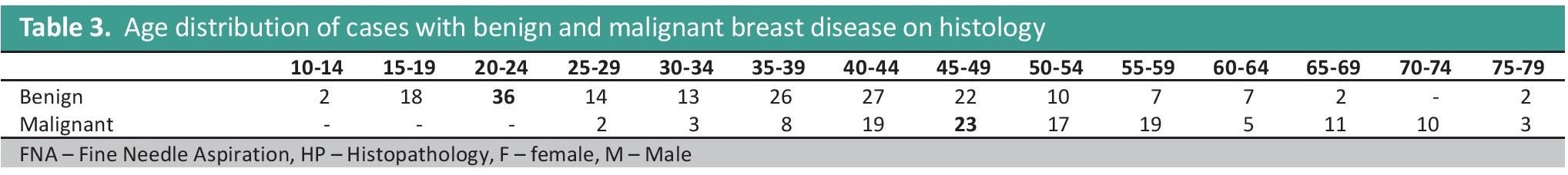Table 3. Age distribution of cases with benign and malignant breast disease on histology