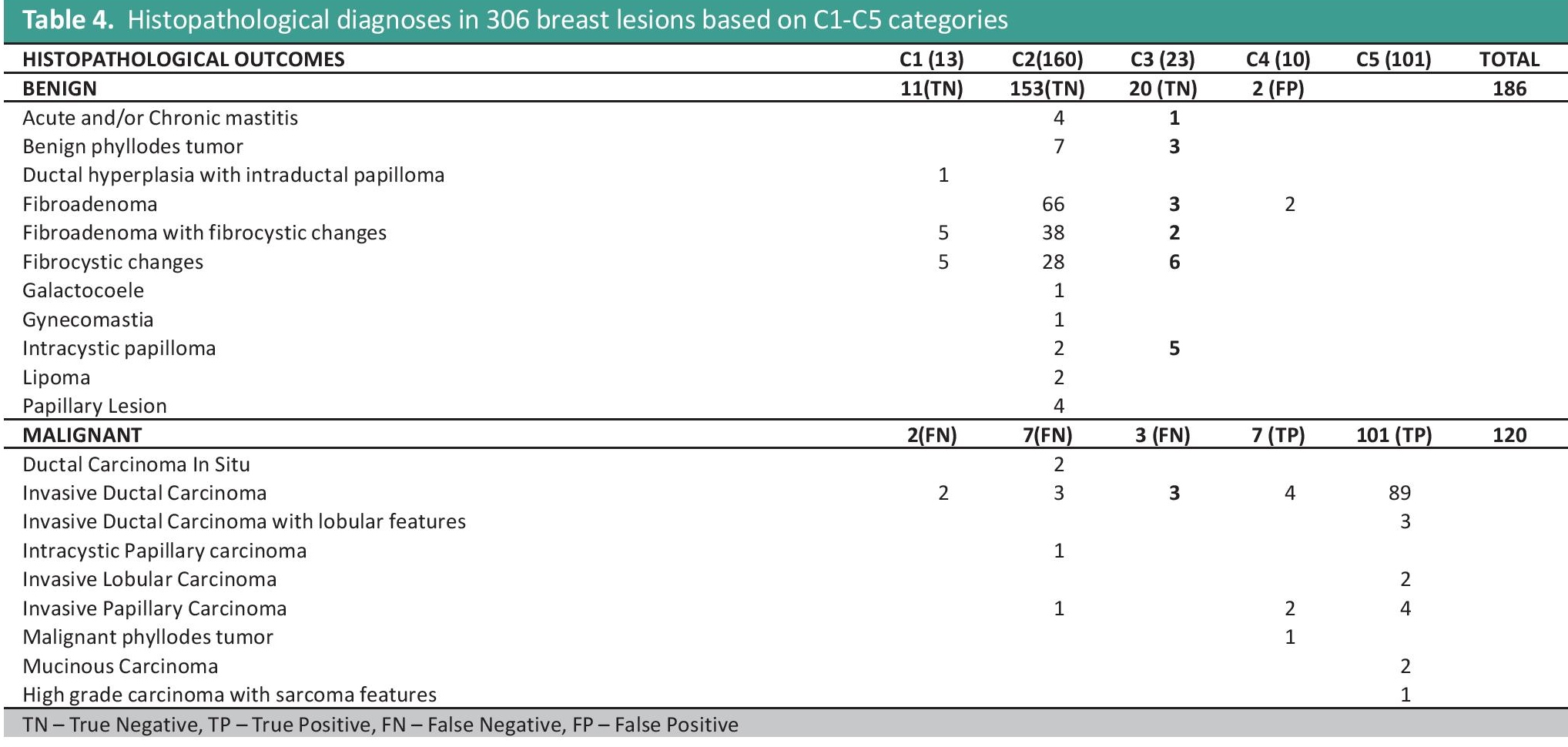 Table 4. Histopathological diagnoses in 306 breast lesions based on C1-C5 categories