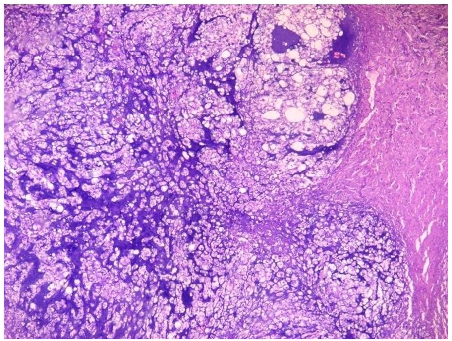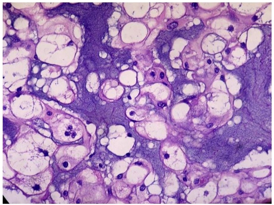Figure 2. Cells with abundant pale, vacuolated/bubbly cytoplasm with small, hyperchromatic nuclei (physaliferous cells) seen alongside cartilage-like areas. There is mild to moderate nuclear atypia and rare mitoses (Hematoxylin and Eosin, 40x).
