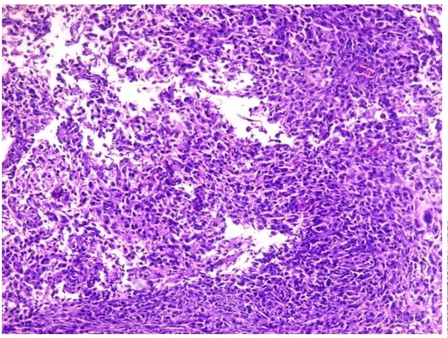 Figure 3. Dedifferentiated area with frank and pleomorphic, sarcomatous morphology (Hematoxylin and Eosin, 20x).