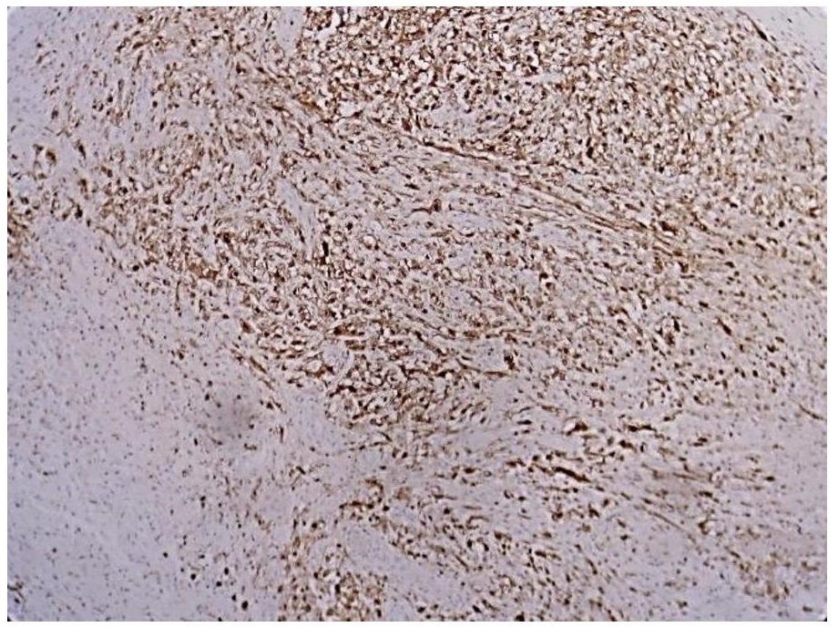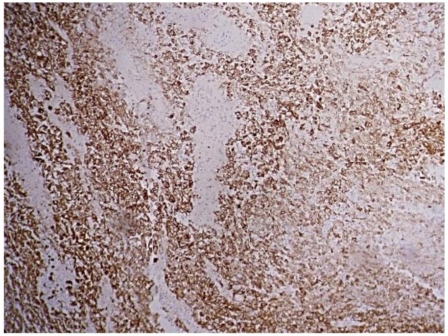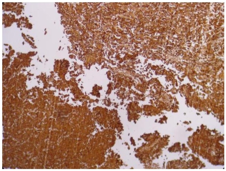 Figure 4. Strong cytoplasmic and membranous staining with Cytokeratin in the tumor cells, including the sarcomatous areas (Cytokeratin, 20x).