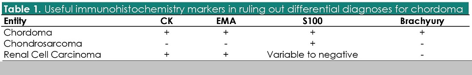 Positivity for CK, EMA, and S100 are traditionally used to support the diagnosis of a chordoma.8 This panel is generally sufficient to rule out the closest differential diagnoses (Table 1).