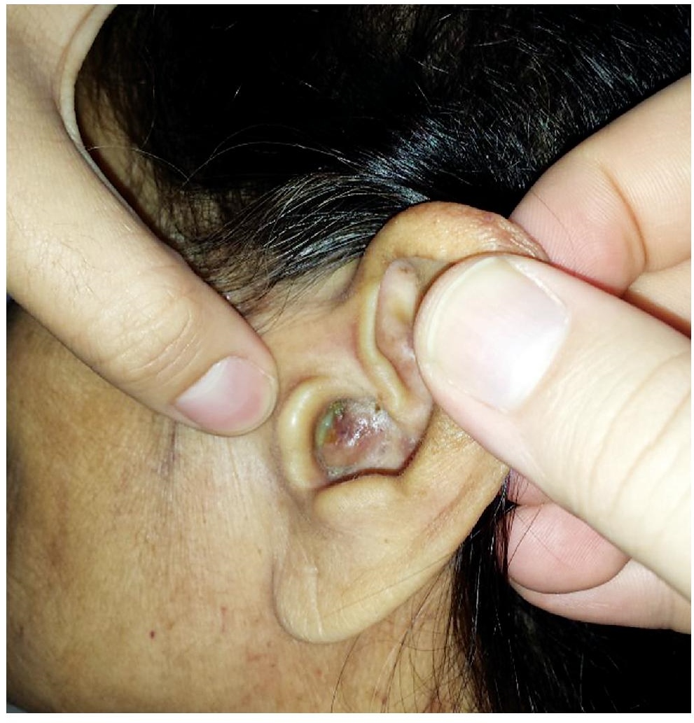 Figure 1. C.M. is a 68-year-old female with a chief complaint of intermittent ear pain secondary to gradually enlarging bilateral ear masses and is shown here with complete obstruction of the left external auditory canal with minimal purulent discharge.