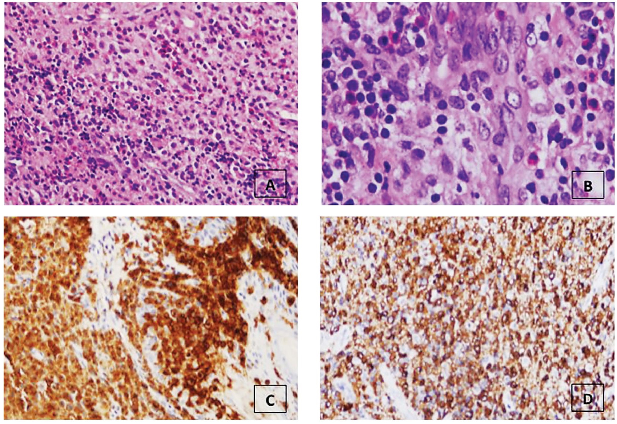 Figure 2. A) The inflammatory cell infiltrates are comprised of a mixed population of polymorphonuclear leukocytes, plasma cells, lymphocytes and predominated by eosinophils (hematoxylin and eosin, 10x). (B) Cellular proliferation of cells with indentations of the nuclear membrane, nuclei with vesicular chromatin, inconspicuous centrally located nucleoli and moderate amount of eosinophilic cytoplasm (hematoxylin and eosin, 40x). Langerhans cells are strongly and diffusely immunoreactive for (C) CD1a and (D) Langerin (CD207).