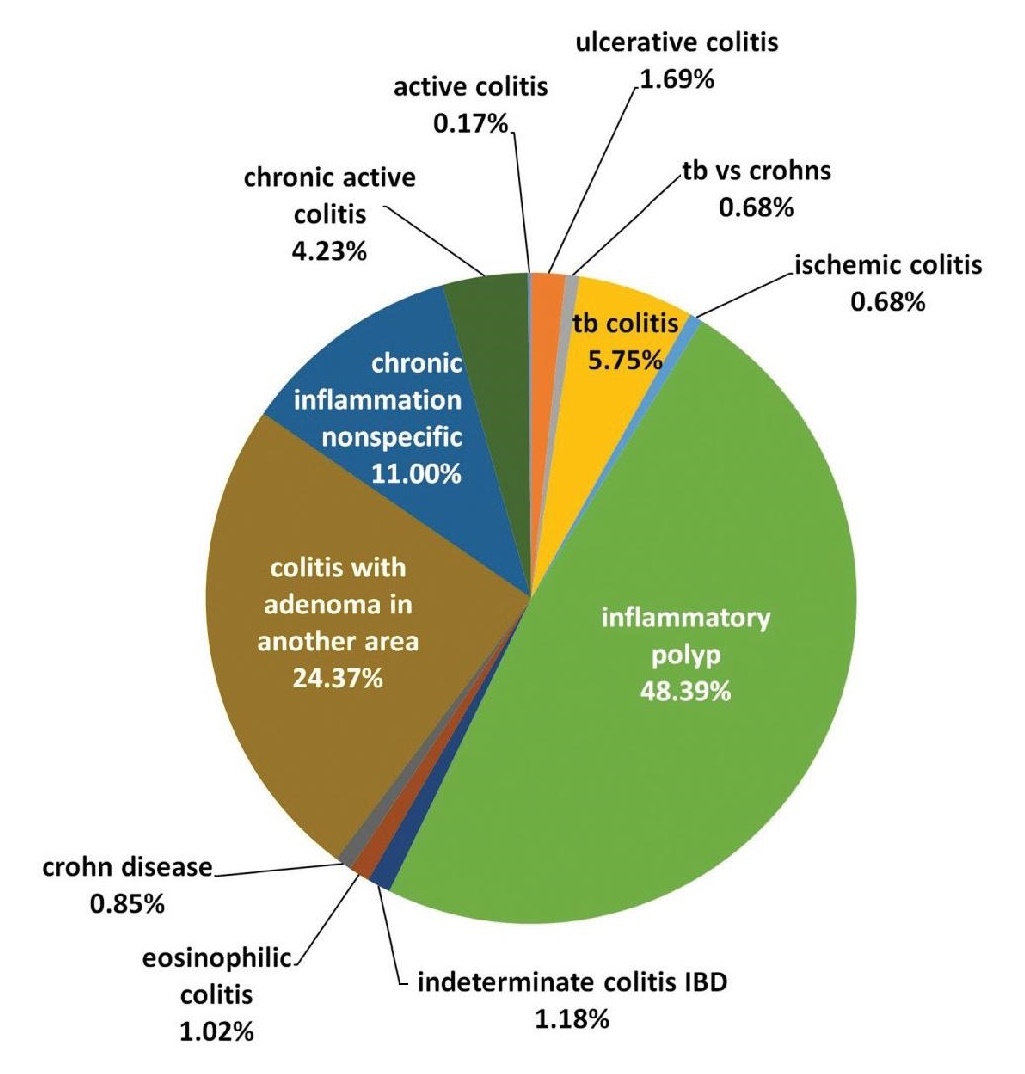 Four patients, accounting for 0.6% of all lower GIT inflammatory conditions, were initially diagnosed as Crohn’s disease, cannot exclude TB Colitis. This is in contrast with 34 patients who were diagnosed with diagnosed with Chronic Granulomatous Inflammation, Tuberculosis which accounted for 5.7% of all patients that were diagnosed with inflammatory conditions of the lower GIT. The remaining 536 patients were composed of acute self-limited/infectious colitis, ischemic colitis, eosinophilic colitis, inflammatory polyp, and nonspecific inflammation.
