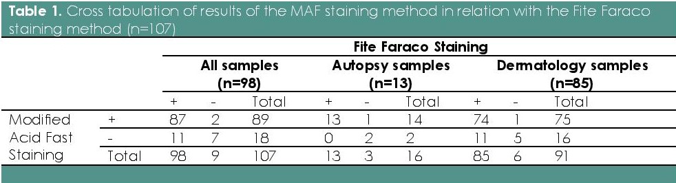 Methodology. One hundred and seven (107) archived tissue specimens from autopsy and dermatology cases interpreted as positive for M. tuberculosis and M. leprae were stained using the proposed modified acid-fast (MAF) technique compared with Fite Faraco (FF) staining method as reference standard. Each specimen was read by two independent evaluators.