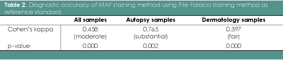 Results showed that the MAF staining method showed moderate overall diagnostic accuracy, compared with the Fite Faraco method. The autopsy and dermatology samples were separated to examine the high number of false negative results in the over-all analysis. All the 11 false negative results were from the dermatology samples. As a result, the MAF staining method for autopsy samples had substantial diagnostic accuracy, compared with dermatology samples.