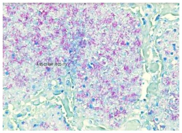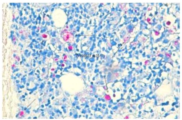 Figure 4. Autopsy sample stained using the Fite Faraco procedure under oil immersion (100X).