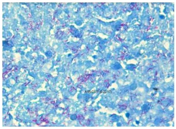 Each of the tissue specimen was read by two independent evaluators under oil immersion microscopy. Bacterial load was determined through quantitative microscopy of the slides under 100X oil immersion lens. The entire area of the section was examined at 100X magnification carefully. The sample is considered positive when one or more acid-fast bacteria is detected in at least one area of the tissue sample. If the bacilli were seen as purple or violet, the staining procedure was repeated with a back-up slide. If there is a difference in the reading of the two evaluators, a third evaluator read the specimen.