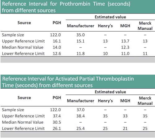 Introduction. To date, there are no reference intervals for prothrombin time (PT) and activated partial thromboplastin time (APTT) based on “normal” Filipino adults. The common practice in most laboratories is to adopt manufacturer provided values or foreign literature even if the importance of establishing or at least verifying laboratory reference intervals has been stressed by Clinical Laboratory Standards Institute (CLSI).
