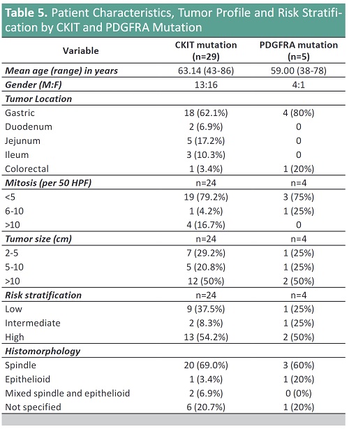 Conclusion: Mutational analysis for CKIT-PDGFRA is warranted among GIST patients, as it may significantly influence treatment protocol in our patients.